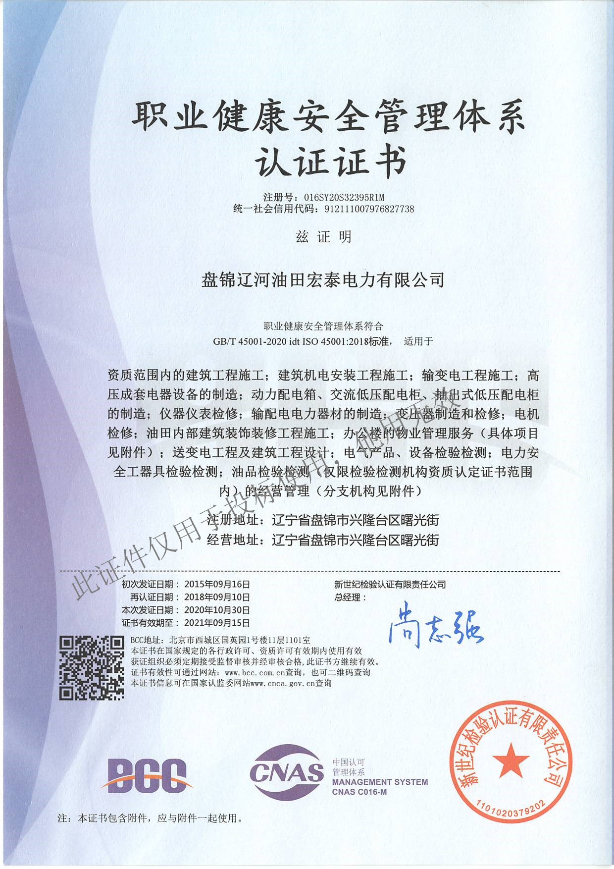 Index of /数据库文件/客户中心/于良波255/盘锦辽河油田宏泰电力有限公司/资质/单一资质/职业健康安全管理体系认证/